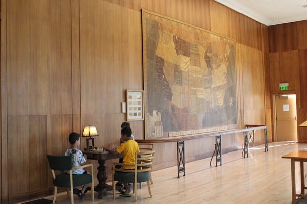 In a landscape of unique hot springs and geysers and abundant charismatic wildlife, our attention is focused outside. But one work of manmade art is worth a moment’s pause – inside. Mammoth Hotel’s Map Room owes its name to a stunning map of the United States as it existed in 1936. Measuring 17′ 2″ by 10′ 4″ and containing 2,544 pieces of wood, the meticulous craftsmanship has been restored to its original beauty by the National Park Service Conservation Laboratory in Tucson, Arizona.